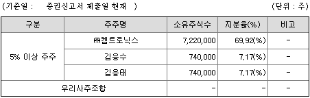 #켐트로닉스 자회사로 #켐트로닉스 69.92% 지분이 있고, 켐트로닉스 김보균 대표이사는 1.16% 지분을 보유했는데, 두 아들인 김응수와 김응태 지분이 7.17%씩 더 많이 있네요. 친척/임원 등 특수관계인까지 포함하면 89.66% 경영권 지분이 있습니다. 여러 투자조합외에, 1%미만 소액주주는 82명 10.38% 수준입니다.
