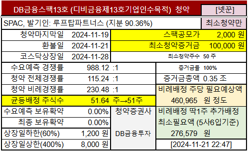 @2024-11-19 청약마감, 전체경쟁률 115.24 :1, 비례경쟁률 230.48 :1, 균등배정 주식수 51.64 주