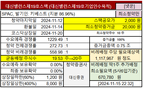 | 대신밸런스제19호스팩 | 11.11~ 11.12화 |