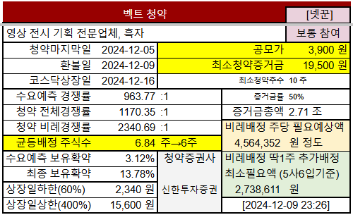 최근 실감미디어 테마파크 조성하는 #닷밀 ( https://lecos.tistory.com/1019 ) 공모주가 있었죠. 공모주 한파로 환매청구권을 썼는데 #벡트 공모주는 흑자기업이라 환매청구권은 없습니다.