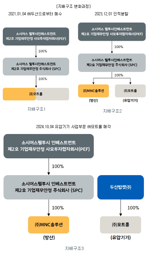 최대주주는 사모펀드인, 소시어스 웰투시인베스트먼트 제2호 기업재무안정 주식회사로 100% 지분을 보유중입니다. 기존엔 두산이 설립해 보유하고 있던 지분을 모두 넘겼습니다. 다른 주주가 없고 구주매출로 공모물량의 절반을 내놓고, 신주물량으로 전체주식수가 늘어, 최대주주 지분은 68.27% 수준으로 낮아집니다.