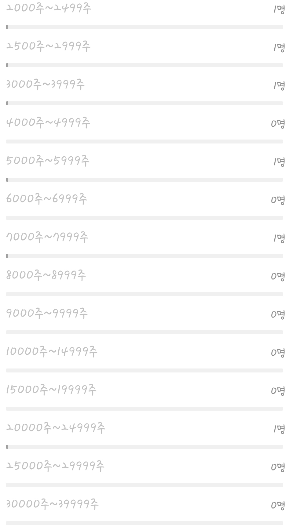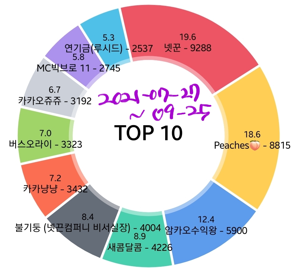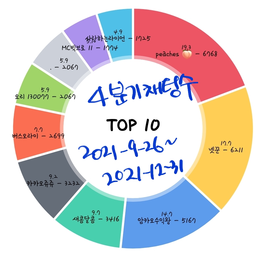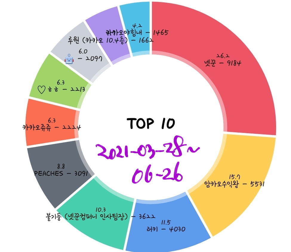 1. peaches 🍑 6,768회 2. 넷꾼 6,211회 3. 암카오수익왕 5,167회 4. 새콤달콤 3,416회 5. 카카오쥬쥬 3,232회 6. 버스오라이 2,699회 7. 오리 130077 2,067회 8. . (카카냥냥) 2,067회 9. MC빅브로 11 1,774회 10. 사랑하는라이언 1,725회 11. 탈출하자 15.2층 1,619회 12. 불기둥 20살 1,568회 13. 카카오입성/130500 1,55 15. 언제 웅장해지지..🐜 1,366회 16. 뚜뚜대디 1,260회 17. 빠라밤 954회 18. 고구마춘식이 945회 19. 주영 937회 20. 쿠우쿠우 / 250주 / 12층 909회 21. Raina 889회 22. V (러키) 866회 23. 카리루리 861회 24. 다람다람 808회 25. 오렌지카라멜카즈아 799회 26. 곰돌카오51주 682회 27. 집에서호랑이를키워도이것보단안물리겠다 653회 28. 카오 530주 651회 29. 하카오 637회 30. 150주 635회 31. Ex카카오직원 621회 32. 할라룽 600회 33. 대주주 해볼게요 563회 34. 🌲ㅋㅋㅇ 526회 35. 제발좀가즈아!!ㅜㅜ 519회 36. today 518회 37. 갈까요 498회 38. 카미 477회 39. 방장봇 455회 40. ♡ㅎㅎ 447회 41. 자수성가 16살 446회 42. 옐로카드 445회 43. 삼팔고카 444회 44. 행복하자 444회 45. 쏘네 439회