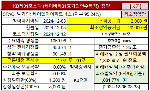 @2024-12-03 청약마감, 전체경쟁률 450.24:1, 비례경쟁률 900.48:1, 균등배정 11.02주(계산) → 11주