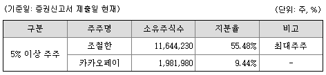 최대주주 조철한 대표이사가 55.48% 지분을 보유하고 있고, 임원들을 포함하면 경영권 지분은 62.20%입니다. 여러 투자조합과 기관/증권사가 투자하고 있으며, 주요 주주로 #카카오페이 9.44% 지분을 보유하고 있습니다. 1%미만 소액주주는 17명 7.07% 수준입니다.