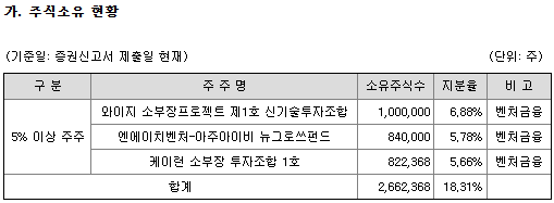 최대주주 고재생 대표이사가 21.74% 보유중이고, 가족 특수관계인 포함하면 29.3% 경영권지분이 있습니다. 산업은행 3.77%를 포함한 꽤 많은 투자조합들이 지분을 보유하고 있고, 1%미만 소액주주는 5명 2.73% 수준입니다.