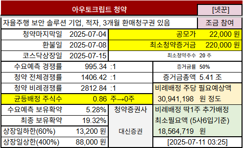 국내 1세대 보안기업 펜타시큐리티의 인적분할로 설립된 자율주행 보안 솔루션 기업 #아우토크립트 공모주청약 정보입니다. 차량내부보안(IVS) 산업의 성장세를 바탕으로, SDV (Software Defined Vehicle)를 기반으로한 기업에 S/W 보안 인프라를 제공하면서 크고 있는 기업입니다. 다만 실적이 그리 안좋네요.