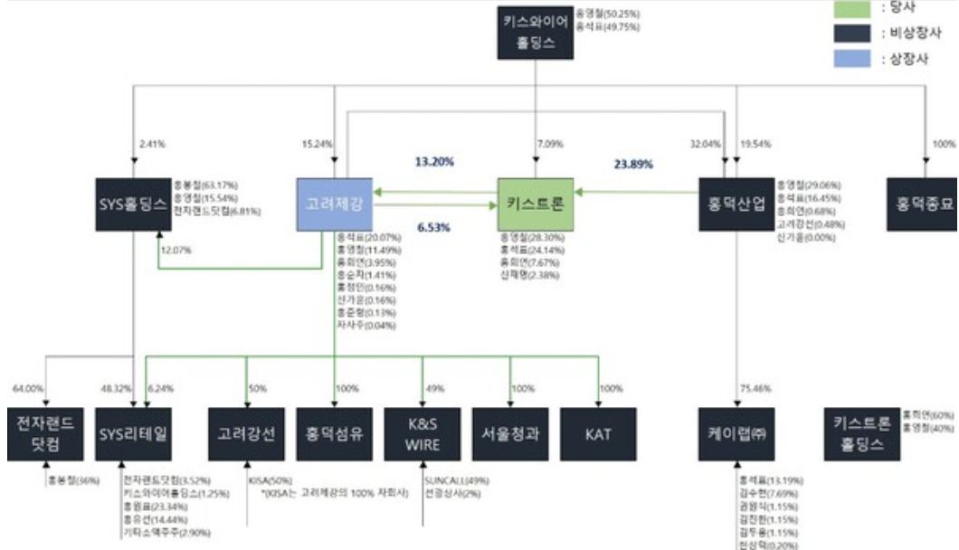 고려제강 지배구조를 보면, 회장/부회장의 #키스와이어홀딩스 아래에 있고, 관계사인 #고려제강 지분을 모두 구주매출로 내놓아서 상호출자는 끊어지는데요. #키스트론 보유중인 #고려제강 지분은 그대로라 고려제강 위에 키스트론이 있게 되는 셈인 것 같지만 #홍덕산업 관계사의 #키스트론 지분은 모두 매출로 내놓지않고 일부만 내놓아서, 상장후 지배구조는 #키스와이어홀딩스 아래에 3개 회사가 그대로 있는 상태에서 #키스트론 → #고려제강 → #홍덕산업 → #키스트론 빙빙 도는 순환출자는 그대로네요. 상호출자 끊고 순환출자는 안고치는데 금감원은 뭐하고 이 상장을 허락했을까요?