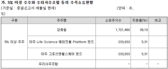 최대주주 강희철 대표이사가 39.10% 지분을 보유하고 있고, 임원 등 특수관계인을 포함하면 42.83% 경영권지분이 있다고 되어있지만, 자사주 0.28%는 왜 빼놨는지 모르겠네요. 여러투자조합이 있는데 대부분 보유지분을 3등분해서 미확약/1개월/2개월확약으로 나눴네요. 1%미만 소액주주는 248명 18.63% 수준입니다.
