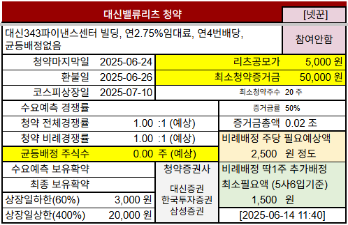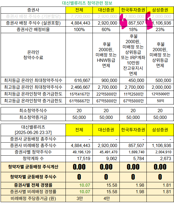 @2025-06-24 청약마감, 전체경쟁률=비례경쟁률 6.37:1 (대신증권 15.56:1, 한국투자증권 0.61:1, 삼성증권 1.01:1)