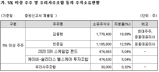 최대주주는 김동현 공동대표이사 18.89% 반준길 공동대표이사 18.89%이며 임원모두 포함하면 경영권 지분은 31.48%이며, 꽤 많은 투자조합이 있으며, 1%미만 소액주주는 8명 4.64% 수준입니다. 대부분의 투자조합들은 지분을 나눠 42% 바로유통 / 29% 1개월보유확약 / 29% 3개월보유확약을 설정했네요.