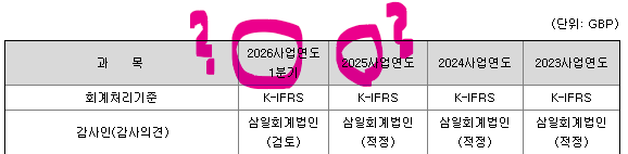 재무제표가 일단 엉망이라 평가하기도 싫어졌습니다. 재무제표를 삼일회계법인에서 적정/검토 표시를 했는데 과연 제대로 본걸까요? 아래표에서 "단위: GBP"는 Great Britain Pound 영국 파운드화를 의미합니다. 표 하나가 더 있는데 원화로 표시되어있구요. 두 표 모두 아직 마감되지않은 2025년과 2026년1분기 재무제표가 있네요. 제가 임의로 1년씩 줄여서 만들었습니다.
