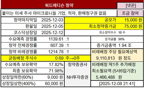 #공모주청약 #경쟁률 #공모가 #청약일정 #넷꾼 #기관수요예측 #기관보유확약 #상장관련주 #쿼드메디슨