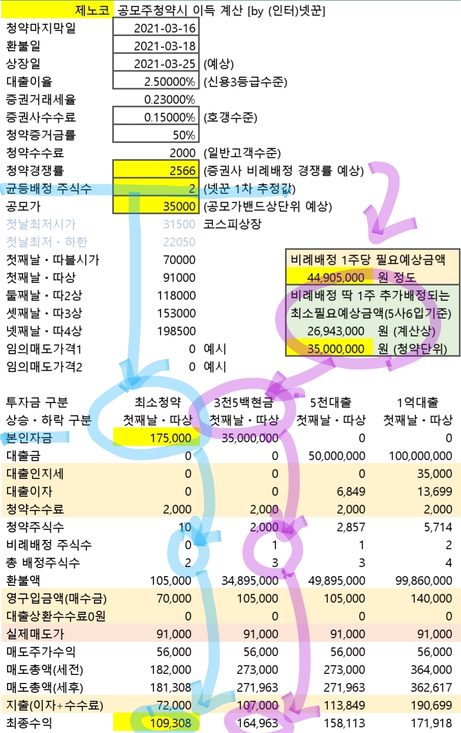 최소청약시 청약증거금 175,000원, 환불액 105,000원, 따상시 세후 수익금 109,308원