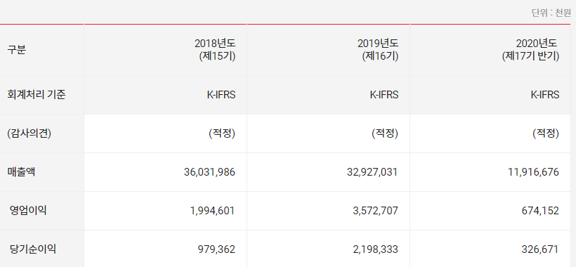 재무구조는 나쁘지 않으며, 매출/이익은 아래 표(출처: 회사 홈페이지)와 같습니다.