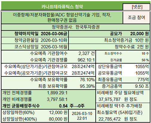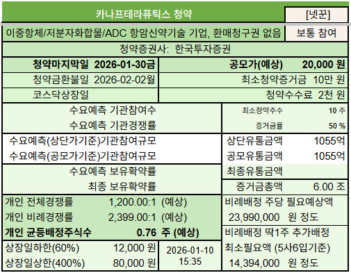 이중항체, 저분자화합물 합성신약, ADC 항체약물결합체 등 여러 특성을 지닌 모달리티를 활용해 개발이 어려운 암 치료에 도전하고 있는 #카나프테라퓨틱스 공모주청약 정보입니다. 기술이전 4건을 앞세워 2026년 제약 바이오 1호 IPO 도전하는 중이며, 주요 전략적투자자인 GC녹십자, 동아쏘시오그룹 회장, 롯데바이오로직스 등 3년간 보호예수를 하는 등 미래를 보고 투자한 투자조합들이 꽤 있네요.