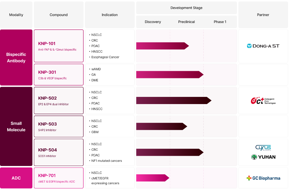 ㆍKNP-101: 면역억제적 종양미세환경(TME)을 특징으로 하는 고형암 치료를 위해 개발 중인 first-in-class FAP 표적 인터루킨-12(IL-12) 사이토카인 치료 후보물질입니다.