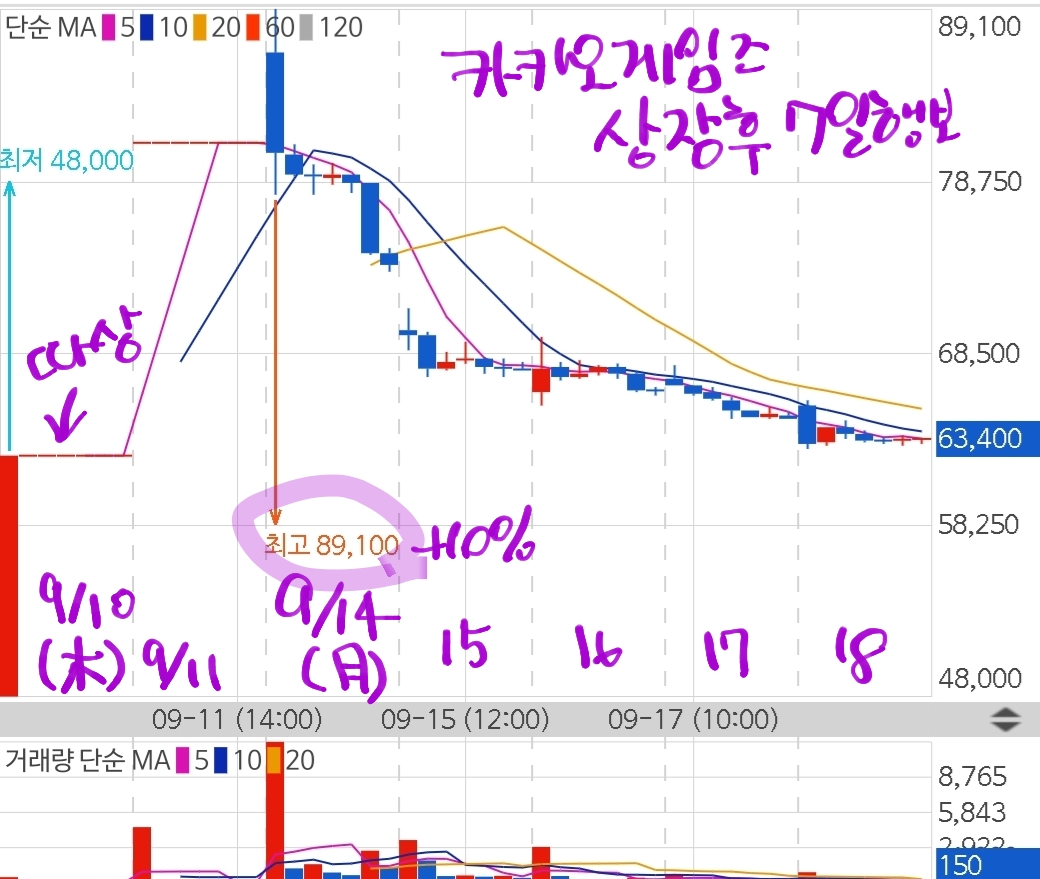 첫날 따상, 둘째날 흔들림없이 따2상 달성(81100원), 휴일지나 셋째날 동시호가는 상한가시작이었지만 그 숫자가 공식적으로 찍히지는 않게 됐고 시초가는 6% 상승으로 시작했다가 약 10%상승(89100원)했다가 줄 곧 하락했습니다.