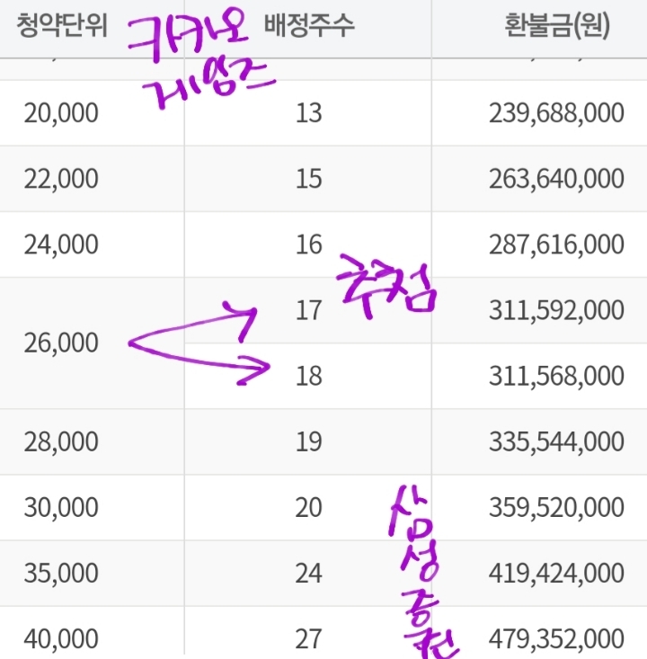 저렇게 26000주 청약하신분은 17주 또는 18주를 추첨으로 받게됐어요.
