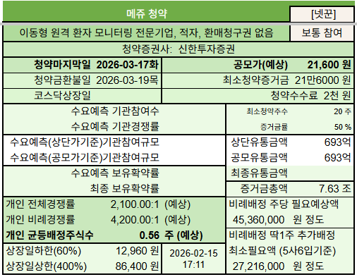 원격진료가 허용되지않는 국내법상으로 시장 진출이 어려운데 코로나 팬데믹동안 많은 변화가 있어서 부분적으로 허용하는 수준입니다. 이 시장을 뚫고 진입하려는 원격진료 솔루션 기업인 #씨어스테크놀로지 ( https://lecos.tistory.com/860 ) 공모가 17,000원이고 작년 6월 상장해서 @2026-02-14 현재 164,100원, 상장이후 9.7배 뛰었네요. 메쥬 역시 비슷한 원격진료 분야이며 초기에 시작된 기업입니다.