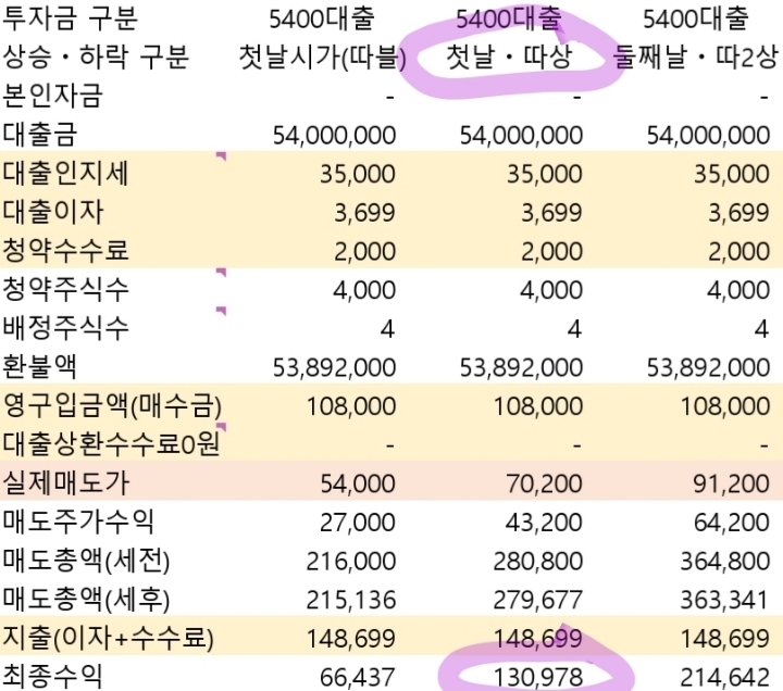 지금보니 위 표에서 두 열씩 같은내용이 반복됐네요. 첫번째 열만 보시고, 따상에서 매도할 경우 아래와 같이 됩니다.