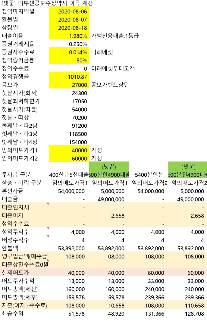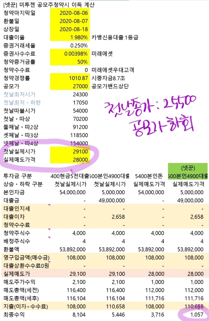 ● #미투젠#미투온 의 자회사영업이익률 높아서 좋은 게임회사게임사는 공모주에서 데인 경우가 좀 있어서 고심하다했음27000원 공모가 4만 적정가라고 하니 상장첫날 팔아야하네요.환불일이 바로 다음날이군요. 하루지나 환불이라 대출이자하루.미래에셋증권만 가능함.
