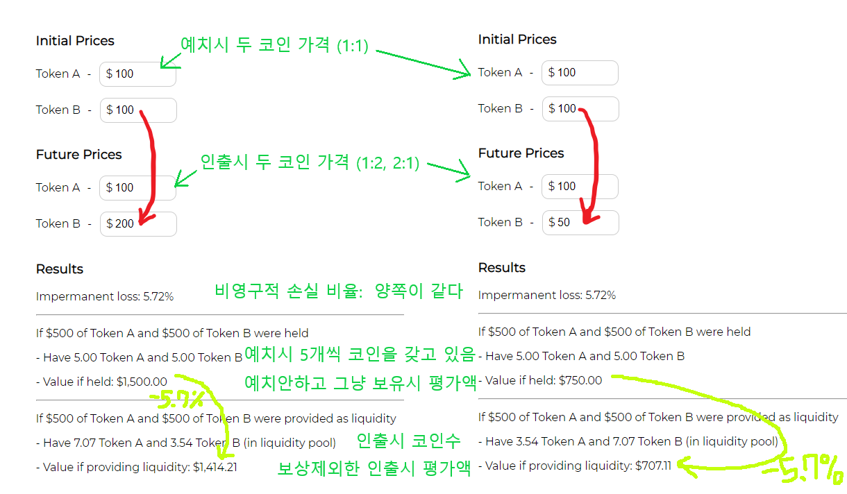 위와 같이 1:1 비율에서 1:2로 변하든 2:1로 변하든 비영구적 손실은 두 코인 가격비율이 바뀌면 무조건 발생하게 됩니다. 그리고 그 비율의 반대 방향으로 코인 갯수가 변하게 됩니다.
