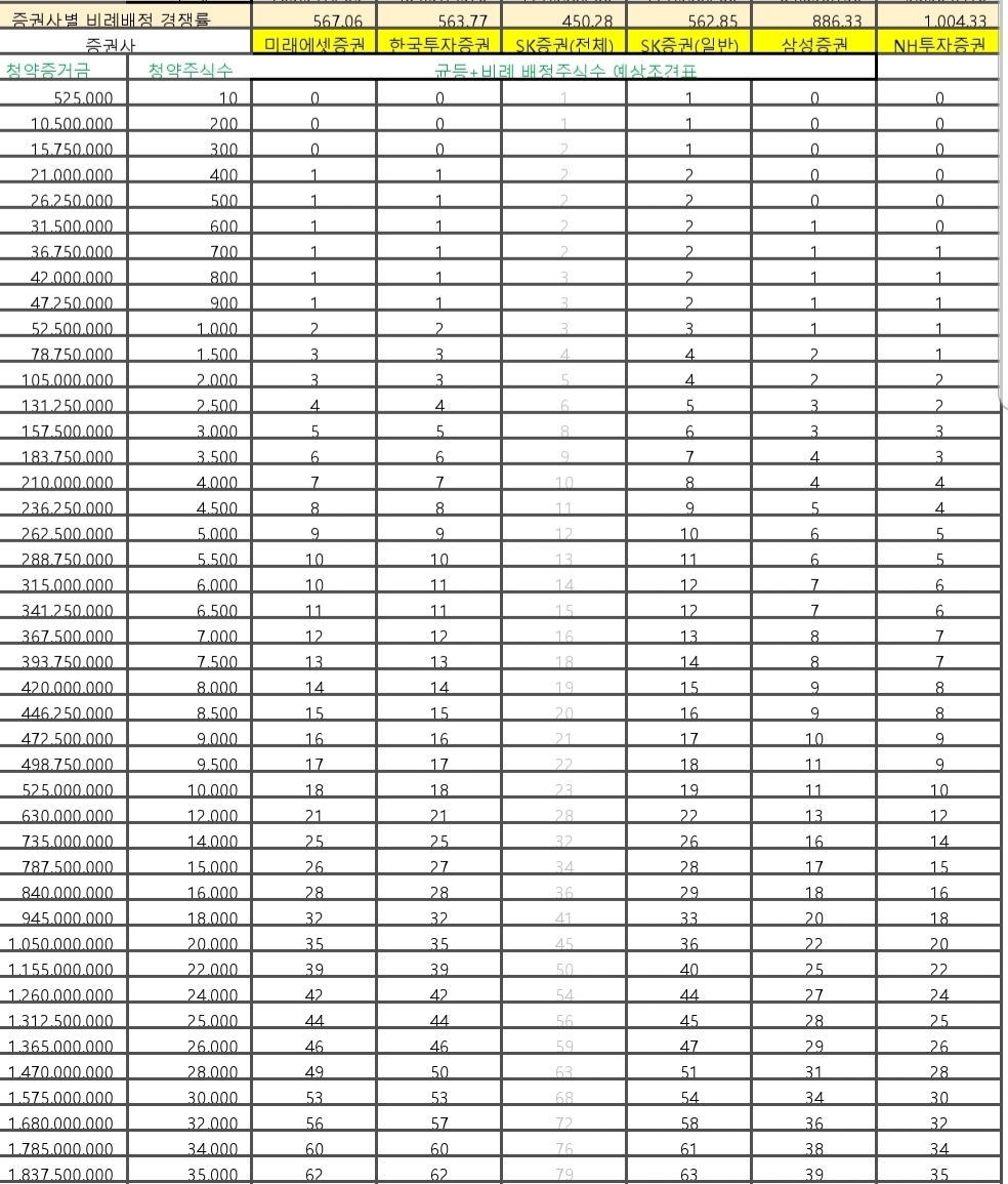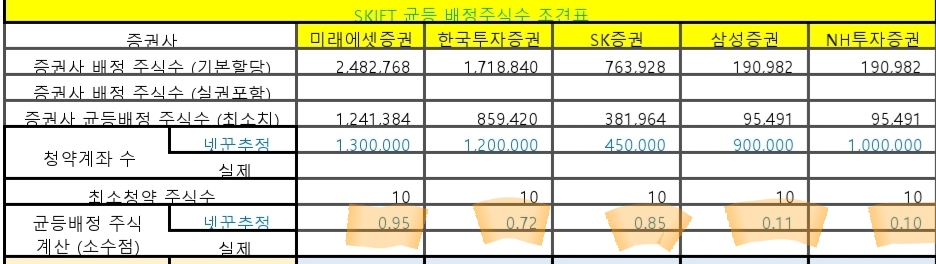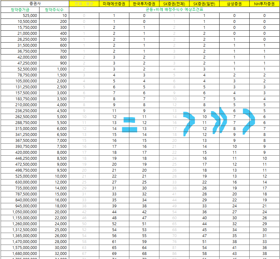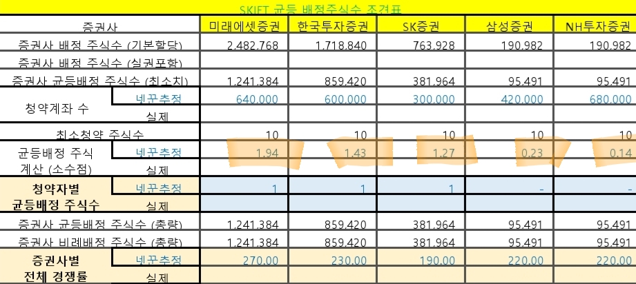균등 추첨물량을 빼고, 비례배정물량만 보면 미래=한투>SK일반>>삼성>NH, 물론 최고는 SK우대고객입니다.