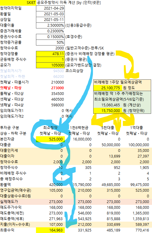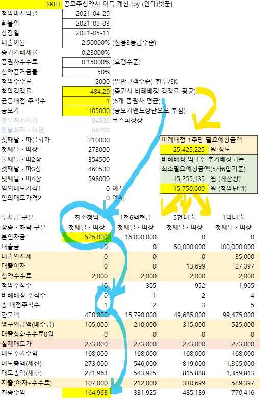 공모가: 10만5천원 확정되어 위 계산대로 보시면 됩니다.