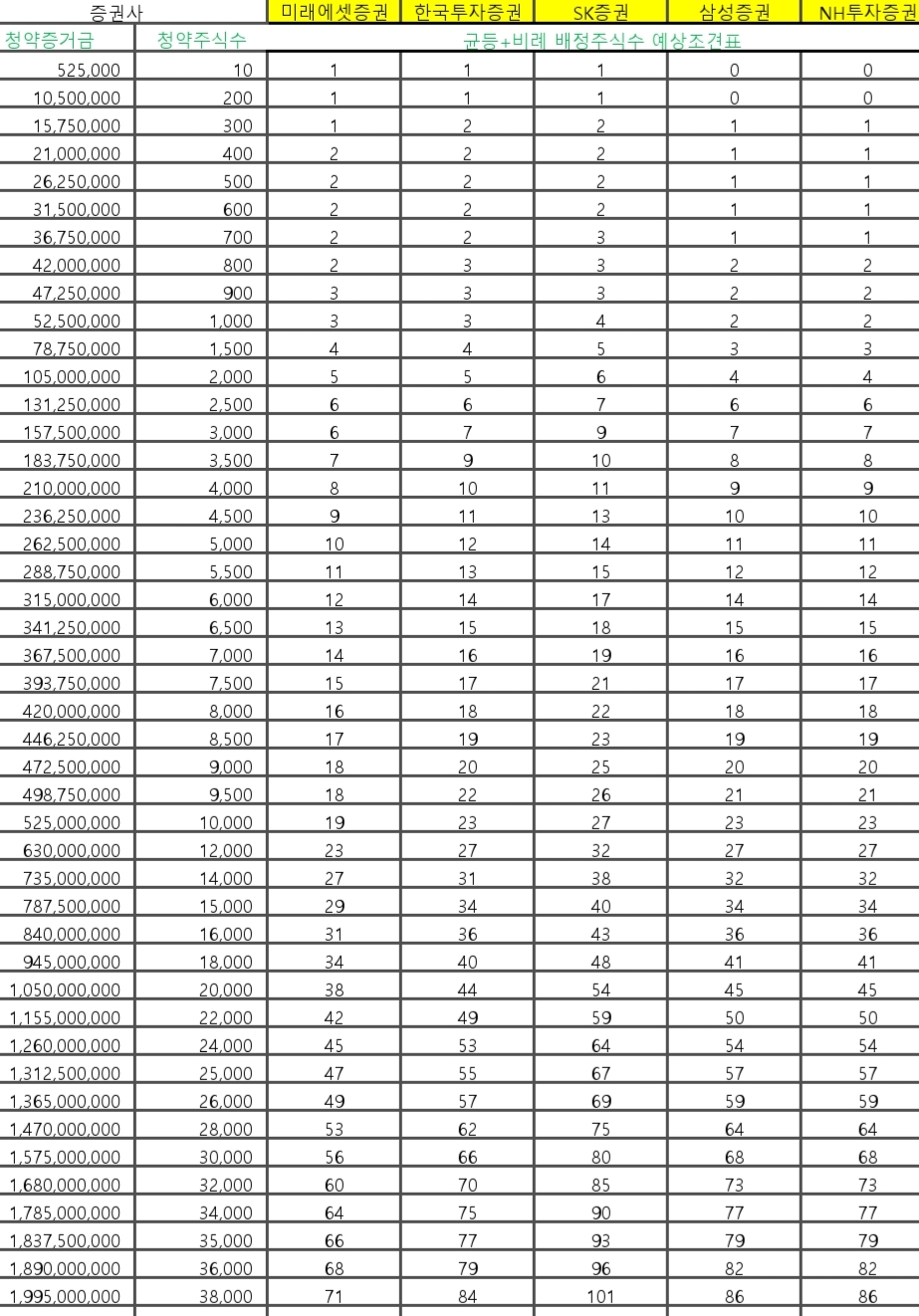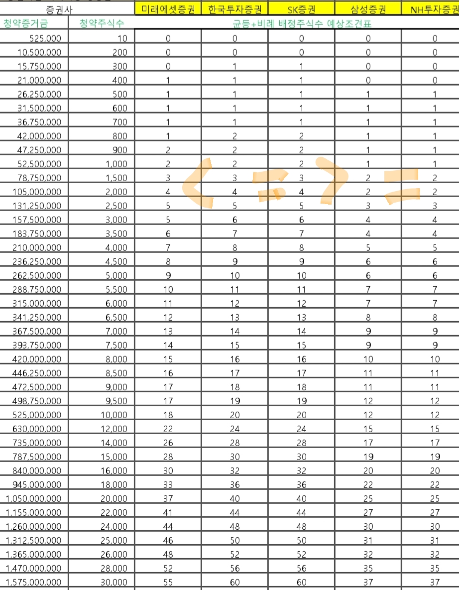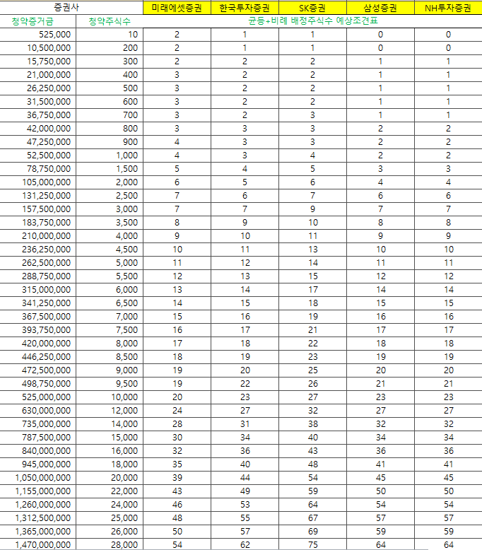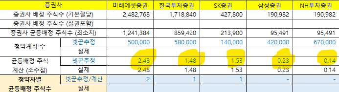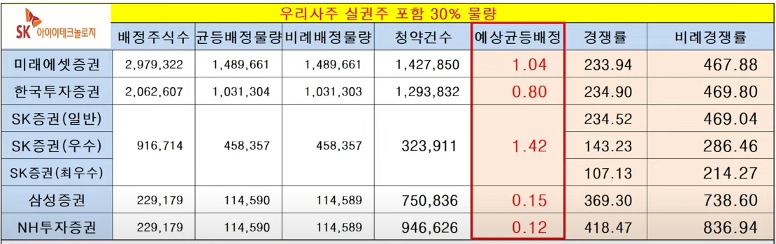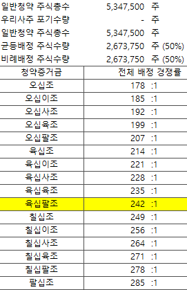 주2) 균등배정 예상: 소숫점부분은 추첨으로 1주 배정하는 것으로 1.43주일 경우 "1주는 모두 + 43% 추첨해 1주추가"