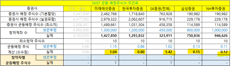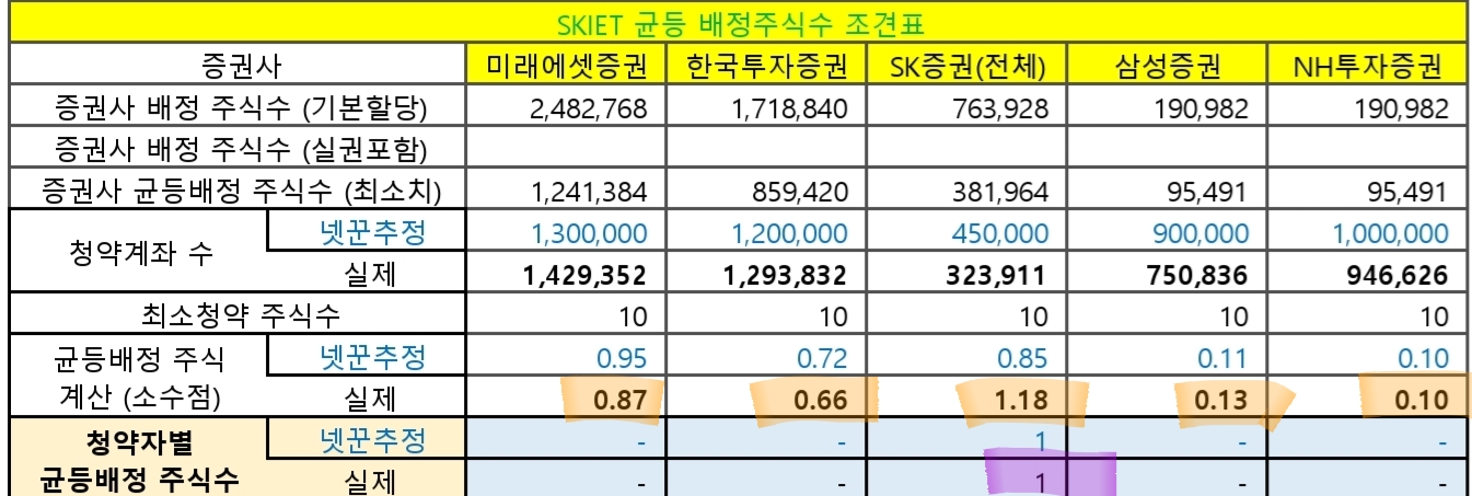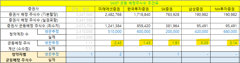 | SKIET | 경쟁률 | 증권사배정 | 균등배정 | 청약건수 | 청약주수 |