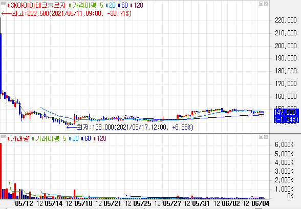 상장일 시초가는 21만원 따블 달성했으나, 잠깐 반짝 올랐다가 하락반전되어 첫날 공모가의 47%인 154500원까지 내려갔습니다. 둘째날도 연이어 하락해 5일연속 하락세 였으며, 2021-05-18부터 반등했는데 그렇게 큰 폭으로 반등하지않았습니다.