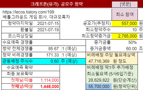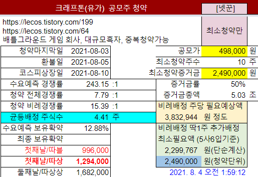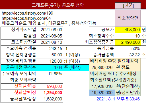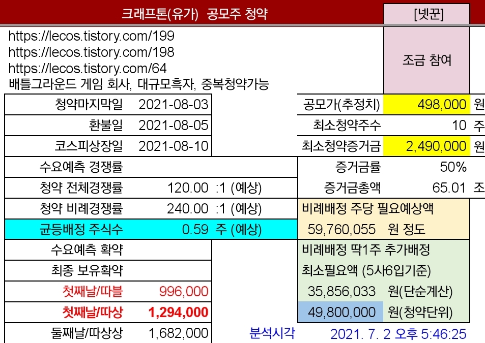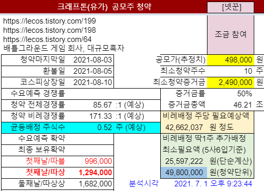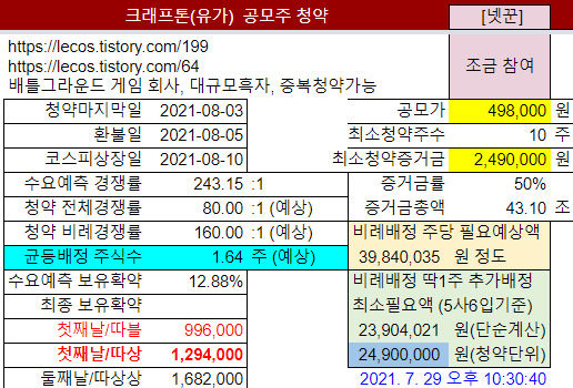 ㆍ크래프톤 공모가 밴드 산정논란: https://lecos.tistory.com/198[2] 공모가밴드: 400,000원 ~ 498,000원최소청약 증거금: 공모가밴드상단으로 정해질 경우 2,490,000원