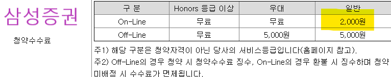 ㆍ온라인청약시 청약수수료: NH투자증권 청약수수료는 여전히 무료입니다. 미래에셋증권과 삼성증권은 최근부터 일반고객만 후불 2천원 (단 0주 배정시 모두 수수료 면제) 생겼고, 등급 높은 고객은 무료입니다.