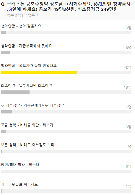 @2021-08-02 9시 카카오주주방 청약정도 투표 캡춰, 제가 투표한 것은 V표시가 있죠. (표시한 그대로 청약했습니다)