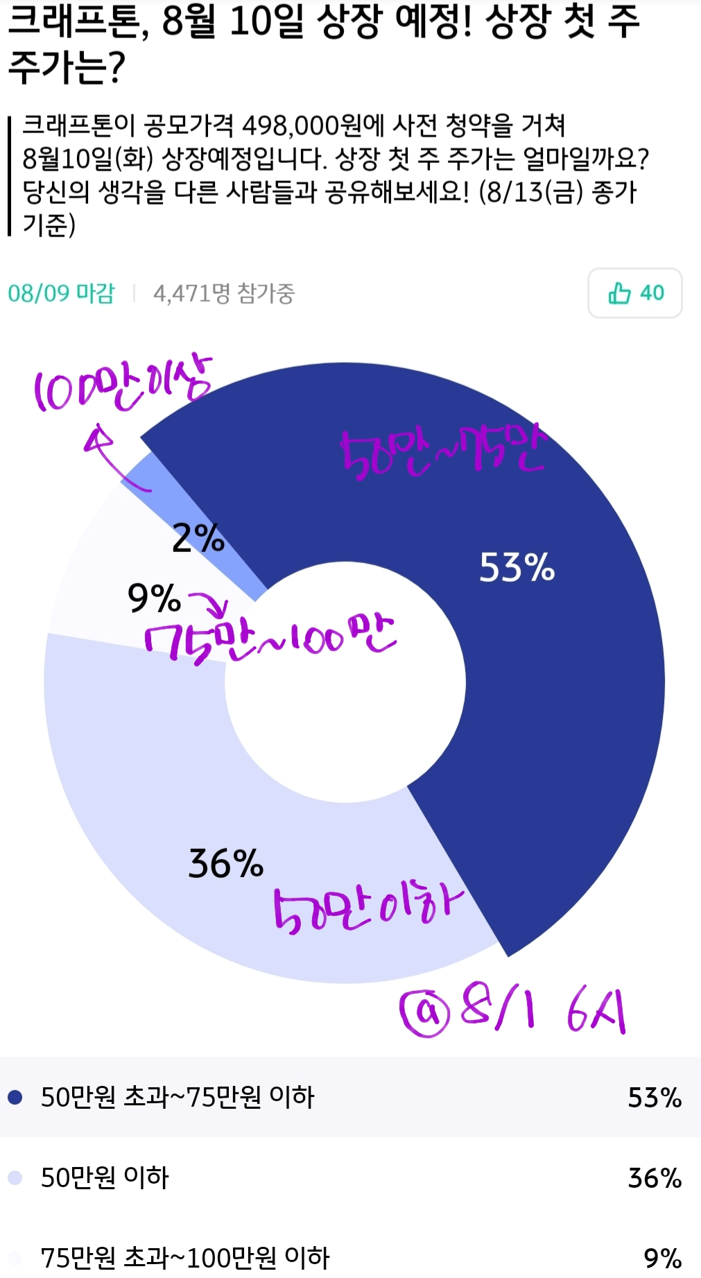 @2021-08-01 저녁6시 SPEC Poll Insight 현재 집계, 상장 당일 종가에 대한 투표가 아니고 상장 4일차 투표네요.