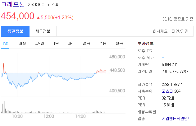 단순히 주가가 높은 건 문제가 안됩니다. #엔씨소프트 주가가 100만원도 넘은 적이 있고, 크래프톤 공모가보다 더 높죠? 크래프톤이 엔씨소프트보다 시총이 더 높은데 엔씨소프트가 돈을 더버는지 크래프톤이 더 버는지 생각안하고 말씀하는 사람들이 대부분이거든요.