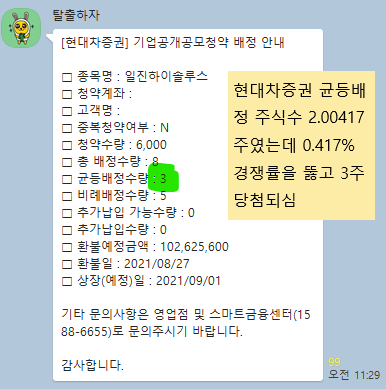 @2021-08-26 카카오주주방의 "탈출하자"님 현대차증권 균등배정 2.00417주 였는데 0.417% 경쟁률을 뚫고 3주배정 받으셨네요. 축하합니다.