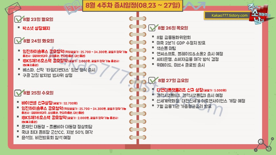 ● 금융통화위원회 (금리인상여부 주목) ● #엔씨소프트 블레이드&소울2 출시 ● #위메이드 미르4 글로벌 출시 ● 공모주청약 배정결과 나올 예정 2건 #일진하이솔루스 - 미래에셋, 삼성, 현대차, 대신증권https://lecos.tistory.com/213 #IBKS스팩16호 (#아이비케이에스제16호기업인수목적) - IBKhttps://lecos.tistory.com/216#IBK ● 카카오엔터테인먼트 주식받기 이벤트 3탄 정답: 악녀https://webtoon.kakao.com/event?event_id=129