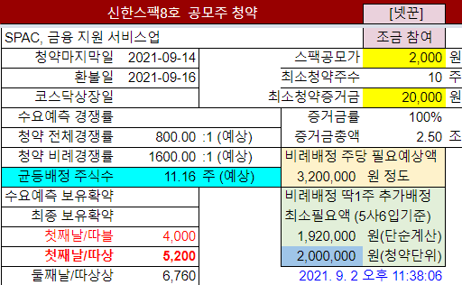| 신한스팩8호 | P | 9.13~ 9.14화 |