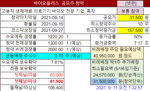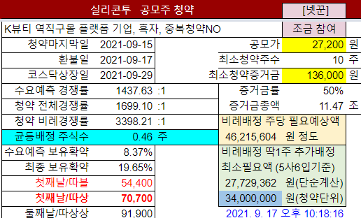 @2021-09-28 청약경쟁률 첫날 130.81:1 마감 1408.69:1 균등배정 3.68주 (계산)