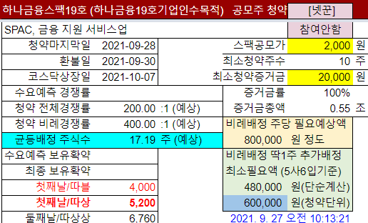 @2021-09-27: #하나금융스팩19호: 최근 스팩 수익률이 청약수수료도 안나와서 넷꾼 청약참여도 내림: "보통"→"안함"