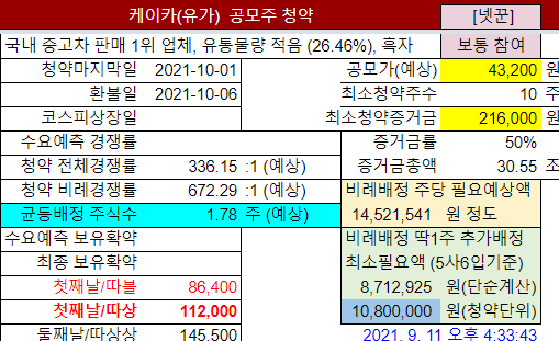 @2021-10-01: #케이카 청약마감 바로전에 조금 더 청약했음 (주주방엔 써드렸는데 공지는 못함): 넷꾼 참여도 올림: "최소"→"조금"
