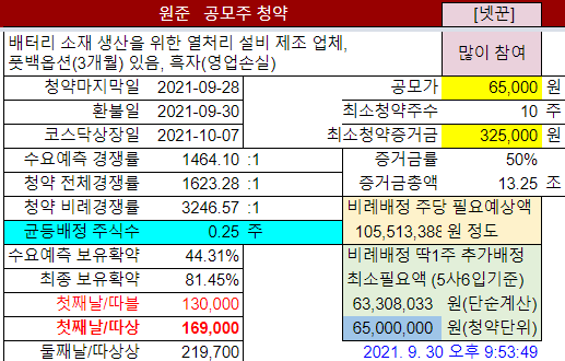 @2021-09-17: #원준 수요예측결과 공시후 기관은 2차전지 관련주로 고려한 듯 보여서 청약참여도 정상상태로 올림: "최소"→"보통"