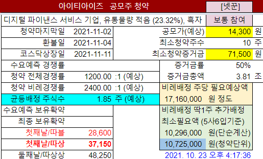 @2021-11-23 청약 마감 경쟁률 150.83:1, 균등배정 40.26주 (청약건수 20180건) 예측이랑 거의 같아서 표 안올려요.