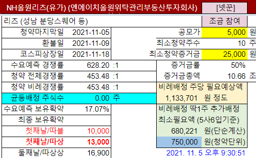※ 공모주 청약 공시상(https://dart.fss.or.kr/dsaf001/main.do?rcpNo=20211119000546)으로는 균등배정 50%이상으로 하고, 나머지를 비례배정한다고 쓰여있지만, 리츠는 균등배정이 없으며 공시상 오류로 보입니다. → 오류가 아니라는 의견이 많아 아래에서 균등 배정 분석으로 변경했습니다.