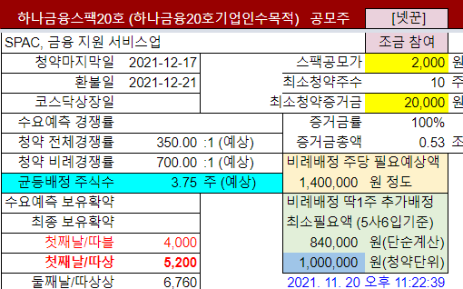 이번달부터 스팩 분석은 이 글 아래쪽에 분석을 넣어놓지만, 그외 공모주는 별도의 글로 기록하니 표에서 링크(☞)를 눌러주세요. 12월이라는 특수성때문에 내년으로 넘기는 종목들이 좀 있을 듯 보이고 12월 하순에는 공모주 일정이 없네요. 12월에서는 케이티비네트워크가 가장 유망한 공모주네요.