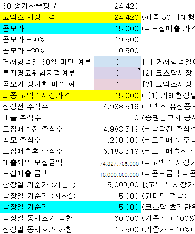 아래와 같이 계산을 해보니 30 종가산술평균이 24,420원이라 공모가가 그냥 기준가네요. 즉, 공모가로 시작하니 안전장치는 없는 셈입니다.