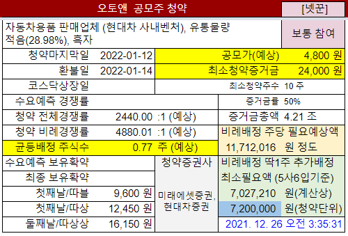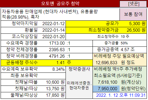 @2022-01-11 청약첫날 경쟁률 160.05:1 (미래에셋 189.97:1 + 현대차증권 40.37:1)