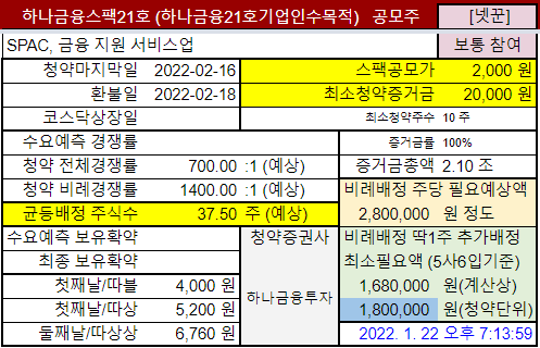균등배정주식수가 5주 넘어 37.5주 이상이니 청약을 그보다 많은 40주 이상으로 하시는게 편할 듯 보입니다. #하나금융스팩20호 상승세를 따라갈듯하여 경쟁률을 높게 잡았습니다.