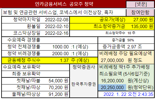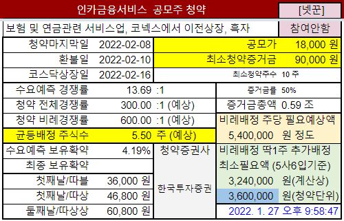 코스닥 상장에 세 번째 도전중인 인카금융서비스, 흑자기업이지만 공모가밴드도 현재 코넥스주가보다 높아서 공모청약의 매력이 보이지않습니다. 또 연기될 것 같은 느낌이네요.